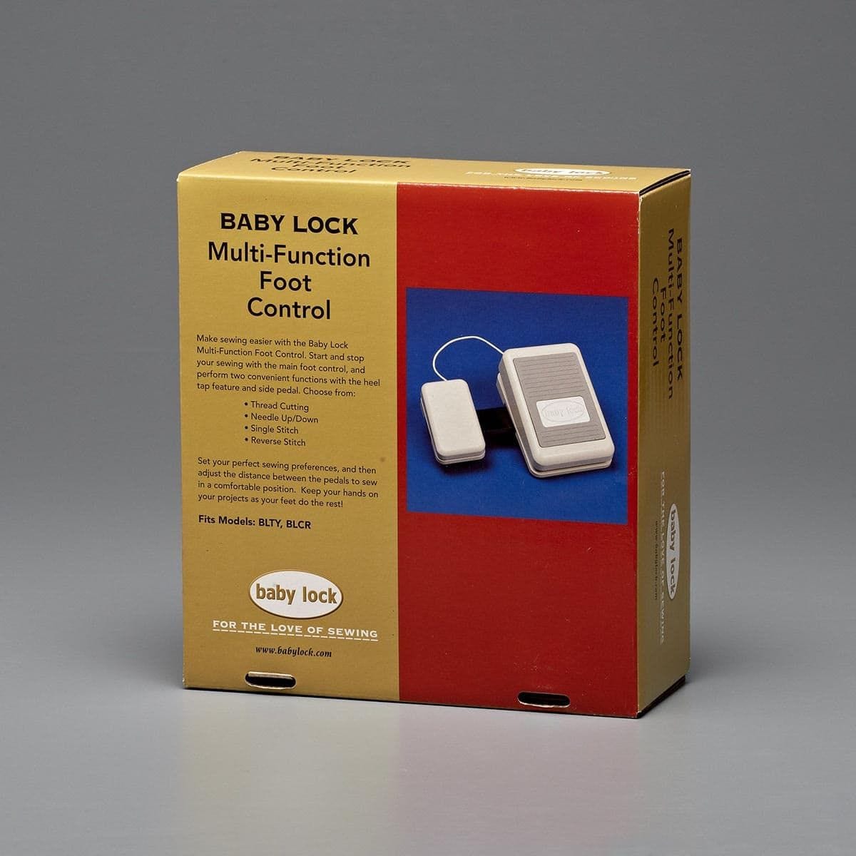 Make sewing easier with the Baby Lock Multi-Function Foot Control. Start and stop your sewing with the main foot control and program two additional functions with the heel tap feature and side pedal.