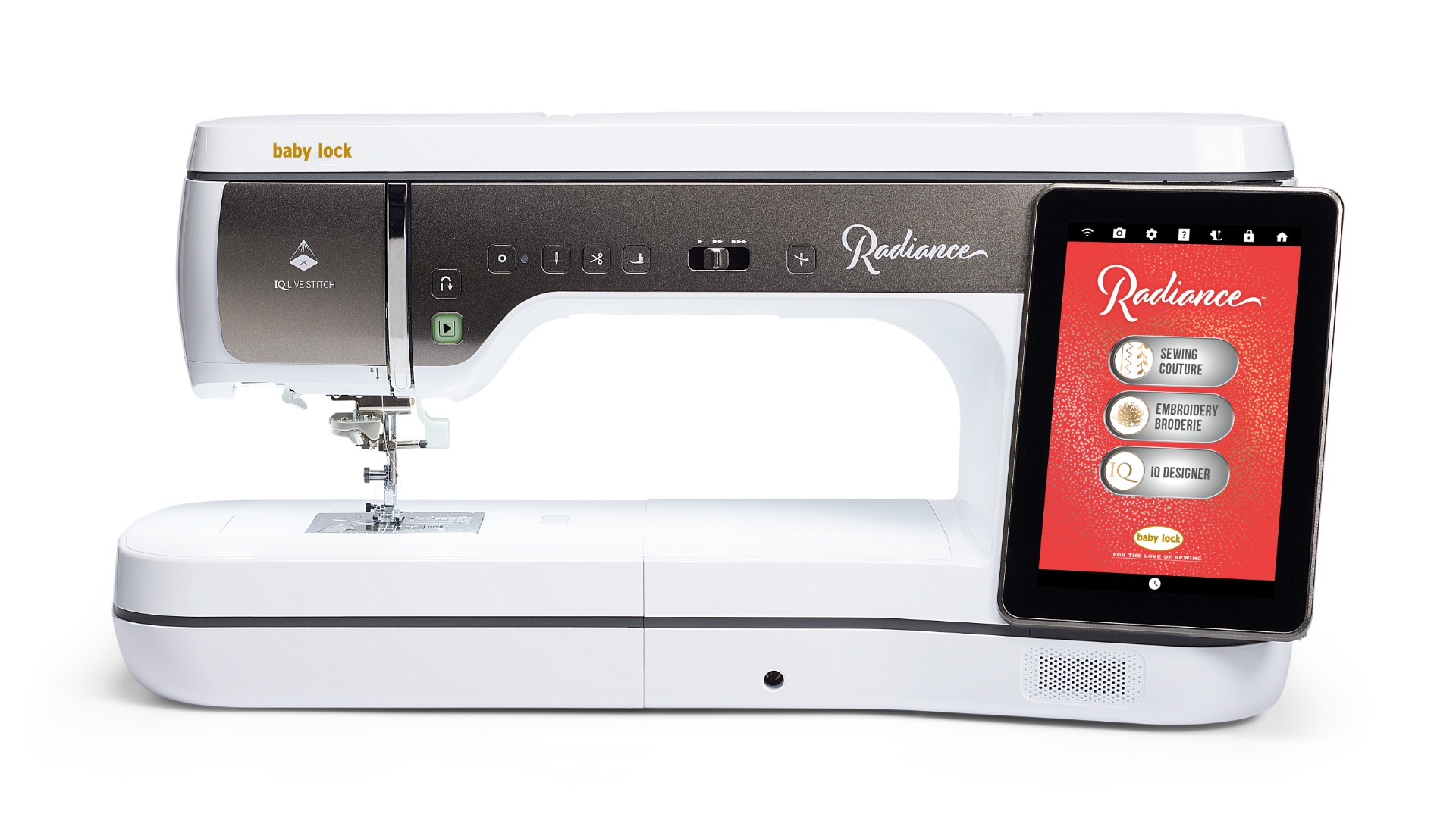 Where innovation meets excellence, the Baby Lock Radiance embroidery, quilting, and sewing machine takes your creativity to the next level. With the largest projection area featuring IQ Live Stitch™ technology, you can project designs and stitches directly onto your fabric for flawless placement every time. The expansive 11-5/8″ x 18-1/4″ embroidery hoop, IQ Designer features, and editing capabilities allow for grand, intricate designs, making your creative possibilities endless. Plus, advanced quilting features like StitchSync Regulation™ enable you to master a wide range of free-motion techniques.